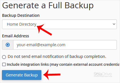 4. From the drop-down menu, select Home Directory as the backup destination and enter your email to receive a notification when the backup is complete.
