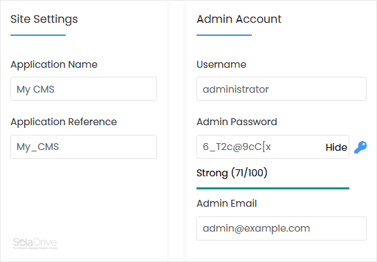 - Admin Username: Your new PyroCMS username (for security reasons, do not use the administrator or the admin username).