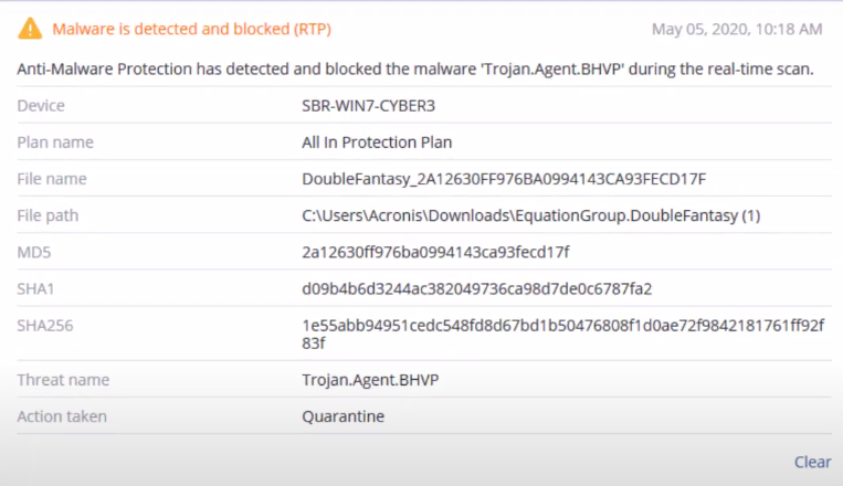 When a malicious file is detected on the device with real-time protection enabled, the following alert will be raised in the Acronis Cyber Protect console under the "Alerts" menu. The file will automatically be quarantined.